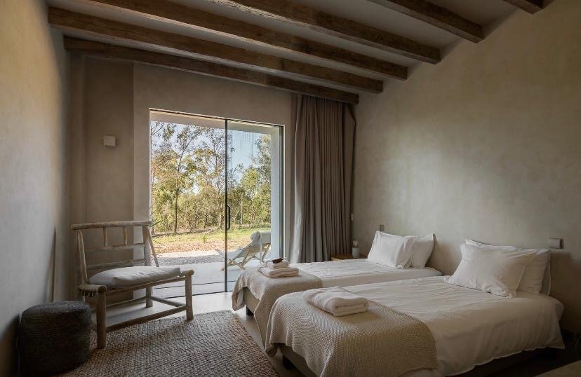 Stone-walled casas in a restored Portuguese estate. Private terrace. Sea views. Two guests per room — designed for ease, not compromise.
